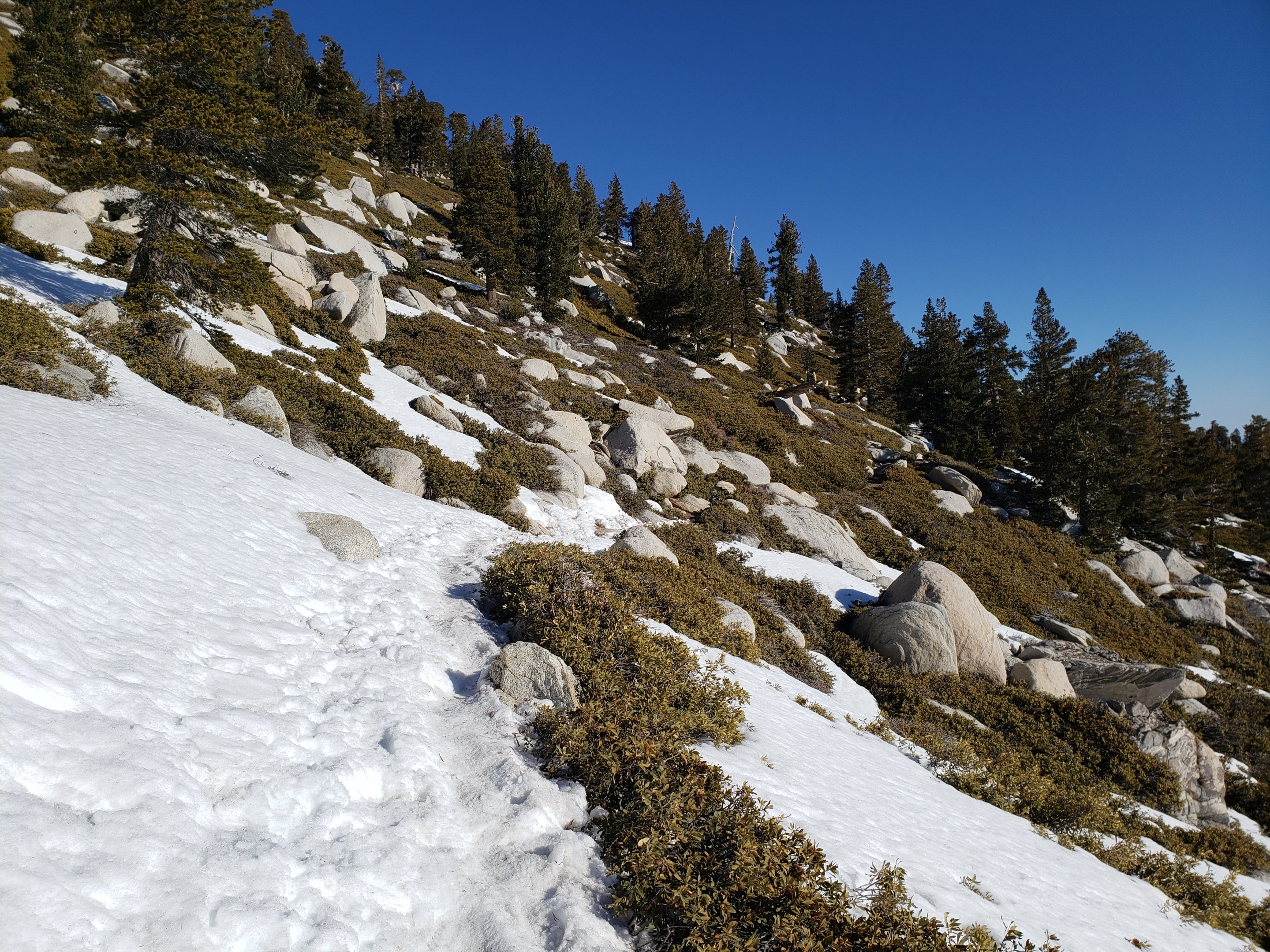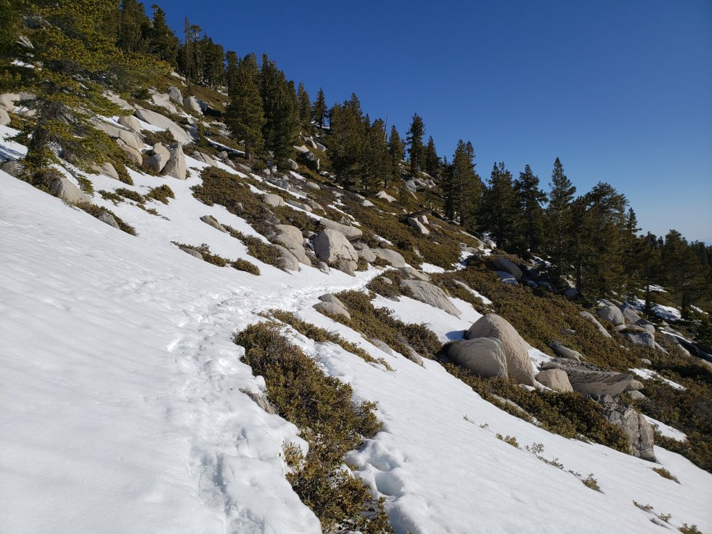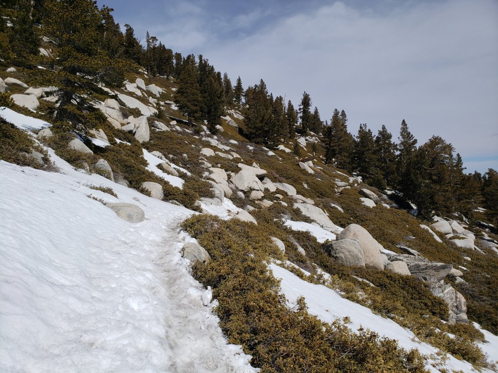 South Ridge Trail is patchily snow-covered (<50%) to Old Lookout Flat at 7800′, with 90% snow cover from there to Tahquitz Peak. This trail has received little hiker traffic so far this year. Microspikes recommended above about 8000′.