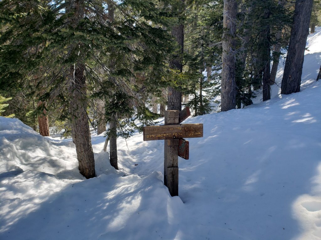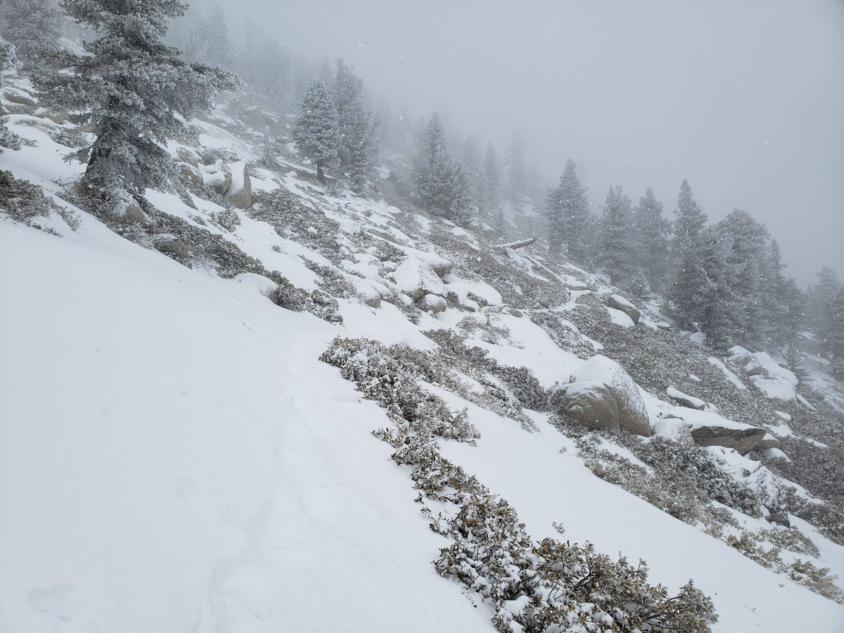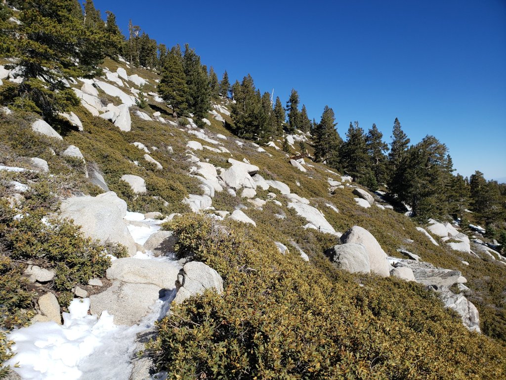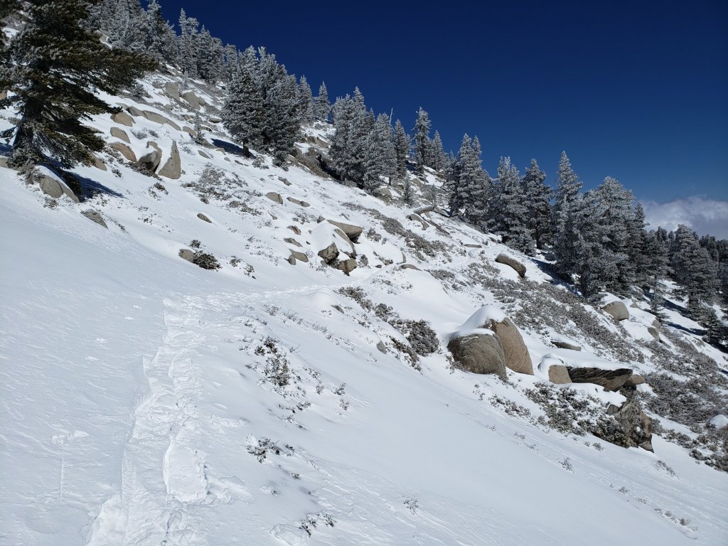 The Peak Trail above 10,300′ has not been traversed since before the late November storms. The only defined trail to San Jacinto Peak from the east is the steep option up the East Ridge.