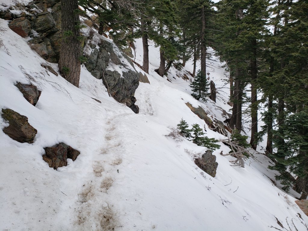 Devil’s Slide Trail has a well-worn track to follow, and microspikes are very useful. Snow cover is patchy and spikes are not essential below 7000′, but higher up snow cover remains >90%.