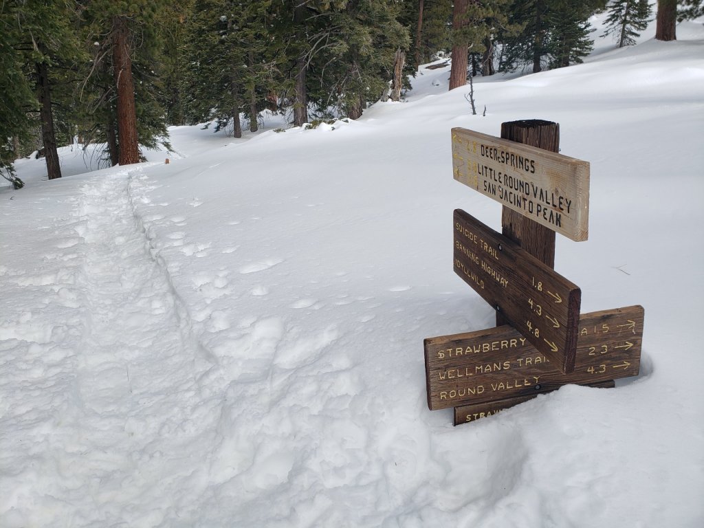The east side trails from Humber Park to San Jacinto Peak – Devil’s Slide, Saddle Junction to Annie’s Junction, Wellman, and Peak trails – all have a very well-defined snowshoe track to follow, although the route does not exactly follow the established trail routes in the high country in places.