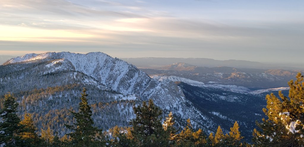 The imposing snow-clad north face of Tahquitz Peak (centre left) as seen from the PCT just after sunrise, 31st January 2021.