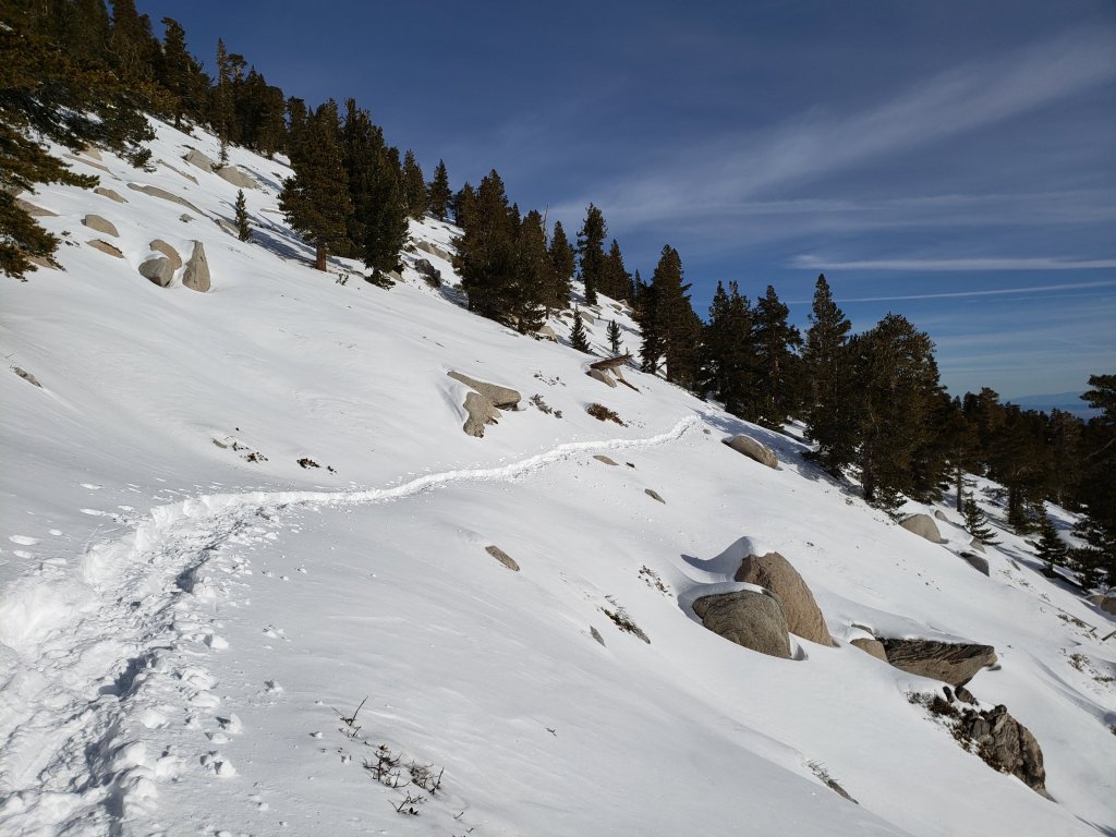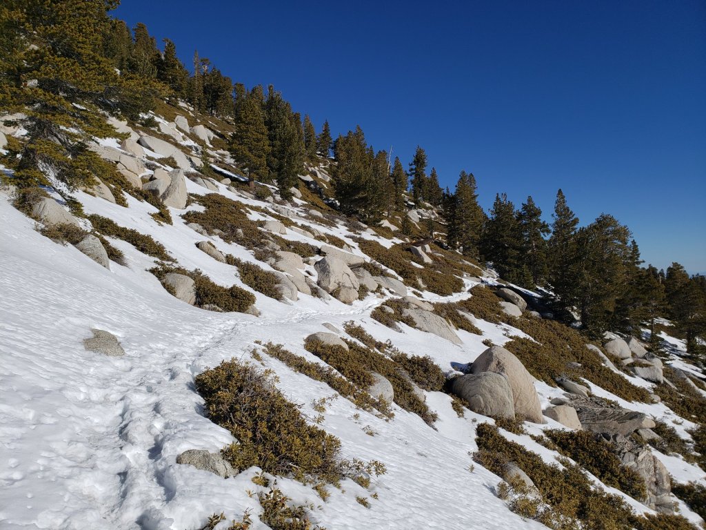 Tahquitz Peak trail from Chinquapin Flat/PCT Mile 178 has challenging steps to follow through the angled icy snow. These icy slopes are notoriously treacherous. Currently spikes (used in conjunction with at least hiking poles, or preferably an ice axe) are essential. Do not attempt to use snowshoes due to the angle of the icy snow.
