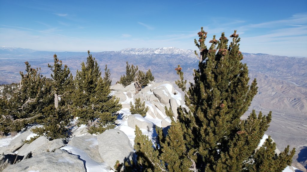 This morning we ascended San Jacinto Peak via the east side (Devil’s Slide, Wellman and Peak trails) and descended via Deer Springs Trail. This allowed for thorough survey of snow and treefall conditions on most of the high country trail system.