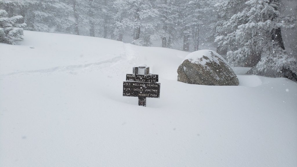 There are two well-defined snowshoe tracks from Long Valley towards San Jacinto Peak, one following the “Sid Davis Trail” and then directly up from Tamarack Valley, and another that roughly follows the Round Valley Trail route emerging near Wellman Divide.
