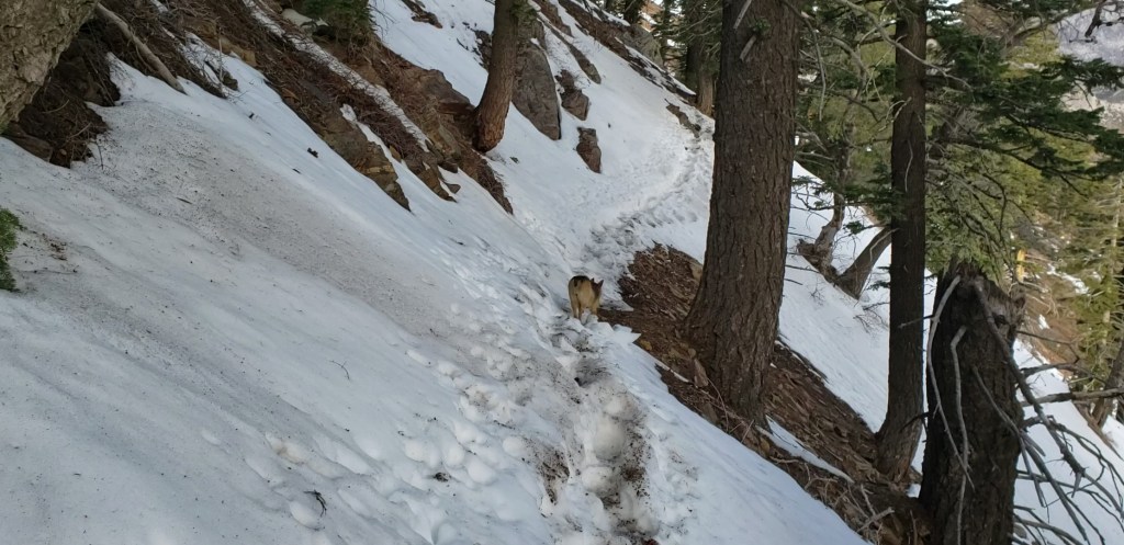 Devil’s Slide Trail is largely clear of icy snow to about 7700 ft, and then with about 40% patchy cover to Saddle Junction. Hikers will generally find spikes useful on the upper trail, especially for descending.