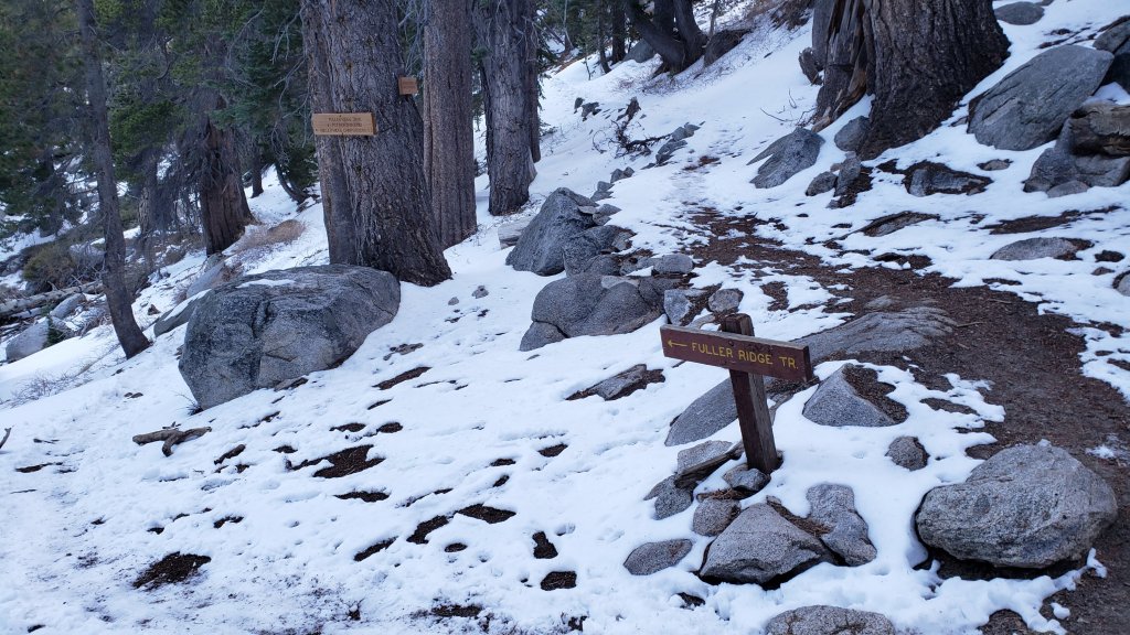 PCT Mile 185.6, the south end of Fuller Ridge Trail at its junction with Deer Springs Trail (8970ft). Above on 25th April 2022, and below a week earlier on 18th April. On the sheltered western slope, snowmelt has been slower.