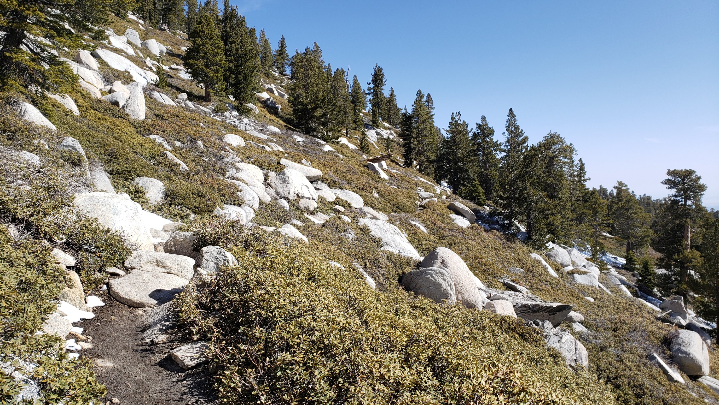 Angled icy snow field remaining on the north side of Tahquitz Peak, 26th April 2022. Spikes (at least) and adequate experience are required to cross this short but challenging section on South Ridge Trail between Tahquitz Peak and Chinquapin Flat/PCT Mile 178.