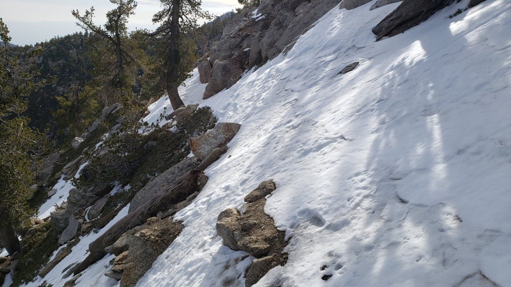 The 0.4 mile section of South Ridge Trail to Tahquitz Peak from Chinquapin Flat/PCT Mile 178 is clearing rapidly. However one extended patch of angled icy snow remains for which spikes, or even better crampons and ice axe, are required (see photo above).