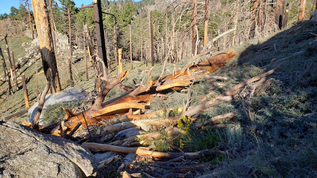Spitler Peak Trail is currently in its most hiker-friendly condition since the July 2013 Mountain Fire. Forty downed trees, most from an ice storm in late December 2021, plus dozens of additional trunks and branches in the trail, were removed by the Trail Report from this trail in early 2022.