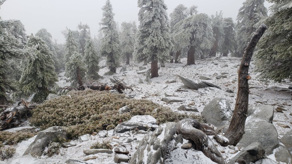 A barely measurable dusting of 0.25 inch of snow fell at San Jacinto Peak overnight following an estimated 0.2 inch of freezing rain that plastered all the rocks with verglas.