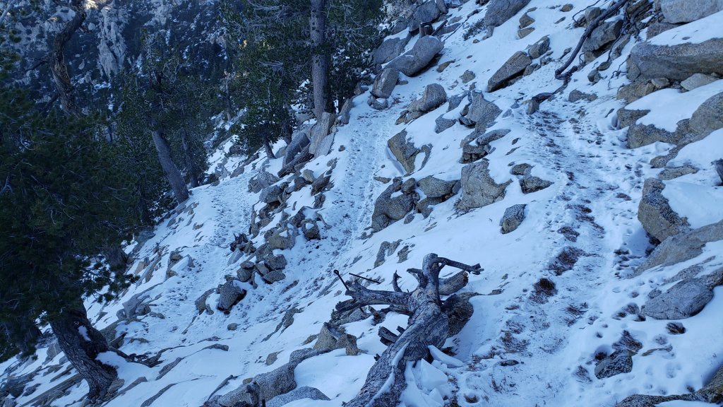 South Ridge Trail (surveyed 19th November) is largely clear of snow from the top of South Ridge Road to Old Lookout Flat at about 7600 ft, with just 5% cover of icy snow. The traverse from Old Lookout Flat to the bottom of the switchbacks has about 40% icy snow cover. The switchbacks up to Tahquitz Peak average only 20% icy snow cover, but the frequency and length of ice patches increases on the uppermost switchbacks. Spikes are useful but not strictly required for ascending, but most hikers will continue to find them very useful for descending. South Ridge Road itself is now functionally clear of ice and snow.