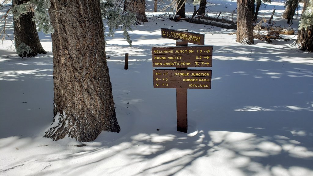 Deer Springs Trail is clear from the Highway 243 trailhead to the Suicide Rock trail junction at 7000 ft, and functionally clear from there to Strawberry Junction (8100 ft), with a few icy snow patches increasing in length and frequency as you ascend. Snow cover is about 60% from Strawberry Junction north for about 1.0 mile (roughly 8500 ft), and thereafter >90% to San Jacinto Peak. An excellent track is easy to follow to Little Round Valley. Above Little Round Valley there are at least half-a-dozen tracks ascending toward San Jacinto Peak, none of which entirely accurately follow the established trail route. The main track is clearest just above LRV and again close to the Peak junction. Spikes are recommended at least for descending upper Deer Springs Trail.