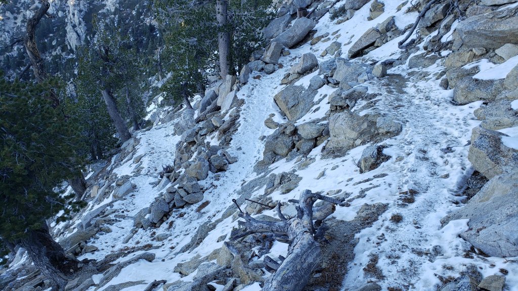 The East Ridge Trail (from near Miller Peak to San Jacinto Peak) has a handful of tracks through the continuous snow, though none (including mine) accurately follow the trail route. Snow on this east slope is drifted, and remains up to 12 inches deep in places.