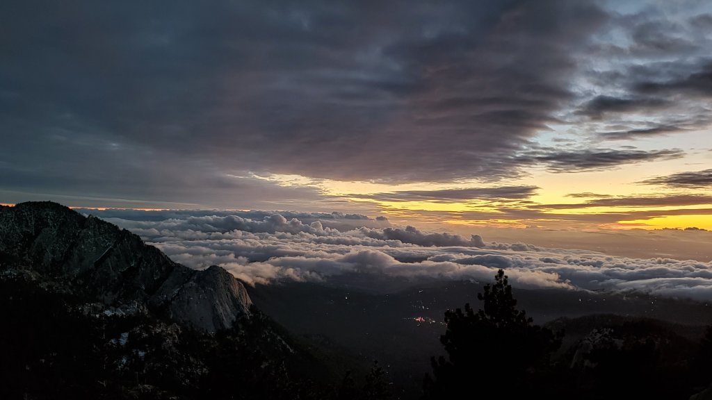 Potentially stormy weather forecast for four periods in the past ten days all failed to significantly impact the San Jacinto mountains. Cold clouds in the high country produced thick rime on the trees above about 10,200 ft elevation on 1st December (photo from 2nd below) but otherwise no meaningful precipitation. On the afternoon of Monday 6th I was treated to moody clouds and virga, a cloud base just above my head at San Jacinto Peak, and the briefest possible flurry of small snow flakes while at the Peak (but nothing settled).
