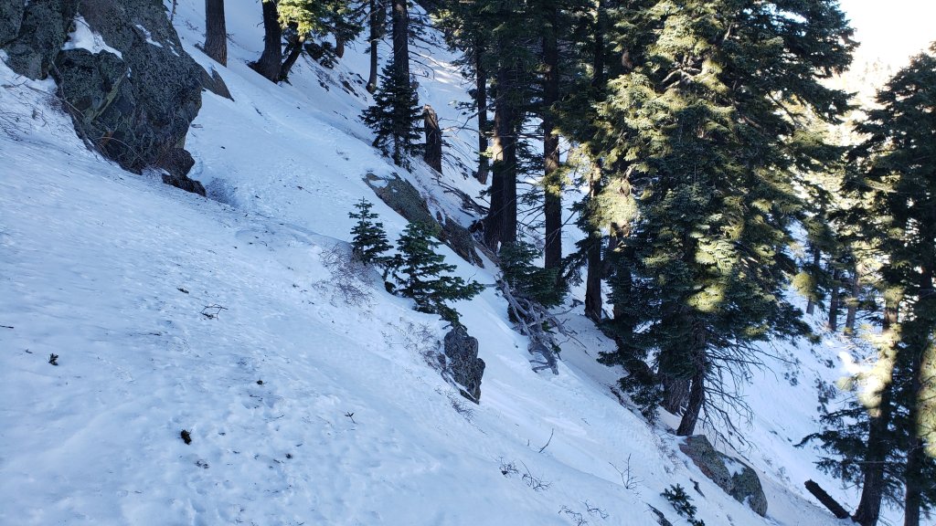 The 0.4 mile section of South Ridge Trail between Chinquapin Flat/PCT and Tahquitz Peak has no steps to follow through the steeply angled ice with overlying deep snow. These icy slopes are notoriously treacherous. Currently crampons, always with an ice axe, and advanced knowledge of how to use this equipment, are required. Snowshoes are not advisable due to the angle of the icy snow.