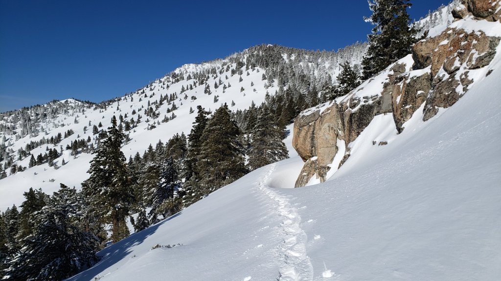 My snowshoe-and-posthole track from multiple ascents/descents continues on to San Jacinto Peak, via a route roughly approximating to the PCT, Wellman, Peak, and East Ridge trails, climbing more steeply in places than the established trails, and generally contouring through the snow as needed to minimize unnecessary elevation loss. This track has now been moderately well-traveled and compacted, and with no significant fresh snow expected it should remain reliable for some time.