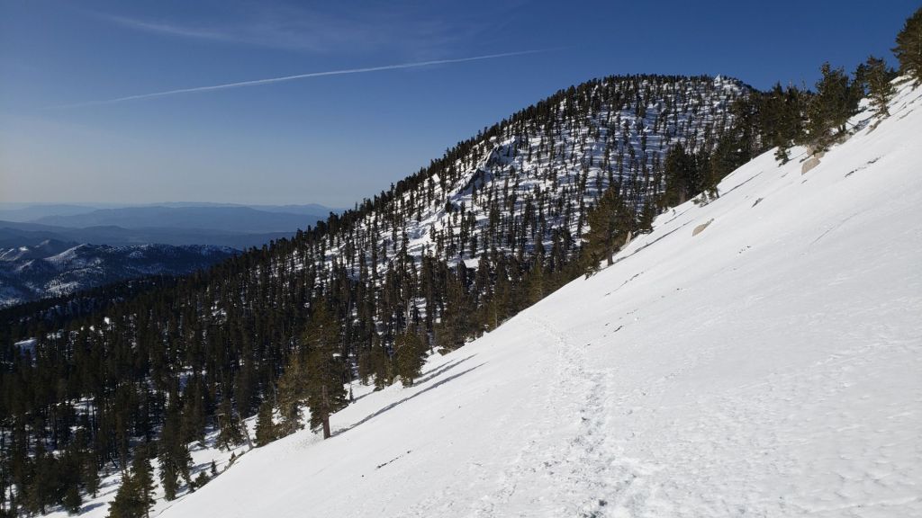 Above the Fuller Ridge junction, there are multiple boot tracks, only occasionally and vaguely following the Deer Springs Trail route up to Little Round Valley, but they will get you there. There is a reasonable track to follow through Little Round Valley, but on the ascent above the valley to San Jacinto Peak the handful of boot tracks going directly upslope are obscure and none even remotely follow the trail. Following any given route is made much harder by the large volume of ice chunks on the slope that have fallen from trees, often obscuring tracks.