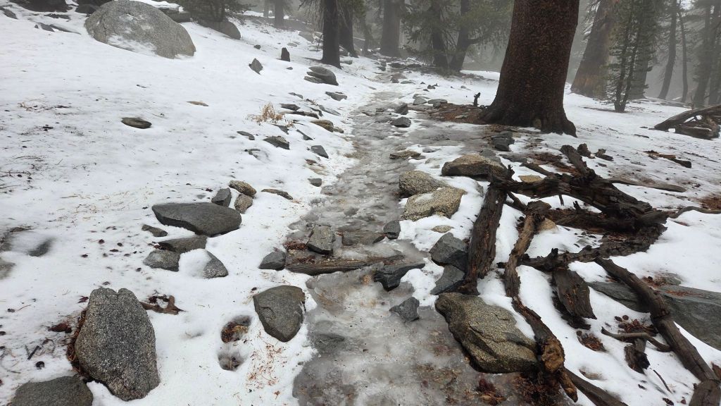 Upper Deer Springs Trail does not have a track to follow through continuous icy snow above Little Round Valley as of Friday 2nd. The existing tracks have been largely obscured by a mixture of melting, rain, and icy fresh snow. Spikes are strongly recommended for this route.