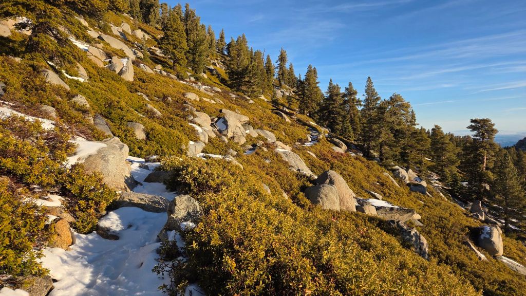 The section of South Ridge Trail from Chinquapin Flat to Tahquitz Peak currently has a well-traveled, uneven track to follow through increasingly patchy angled icy snow. A very thin covering of freezing rain complicates the persistent compacted icy snow remaining from November. These icy slopes on the north side of Tahquitz Peak are notoriously treacherous. Currently spikes are recommended; they may not be essential for hikers very experienced with icy snow travel, but conversely this route will not feel safe for many hikers.