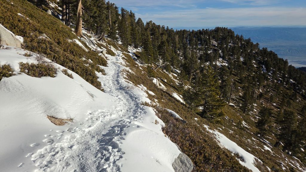 The Peak Trail [surveyed 12th January] has thin but continuous snow cover from Wellman Divide to San Jacinto Peak. Many hikers will find spikes useful, mostly for descending. The least sun-exposed section at 9900-10,100 ft has also drifted the most, and locally depths are 6-8 inches, but snow is very firm with a well-defined track to follow. At this time almost all hiker traffic has remained on the route of the upper trail, with only a rough snow track on the East Ridge Trail route. Immediately around San Jacinto Peak it is extremely icy due to sun exposure and freeze/thaw cycles, and spikes are invaluable.