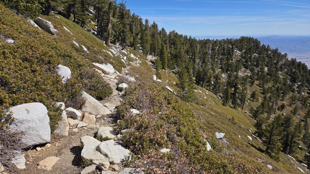 The Pacific Crest Trail is currently clear of snow throughout the San Jacinto mountains. A few snow patches persist between Miles 175-177 but spikes are not required. The Fuller Ridge Trail section (Miles 185.5 to 191.5) has completely cleared of snow extremely rapidly in the past two weeks.