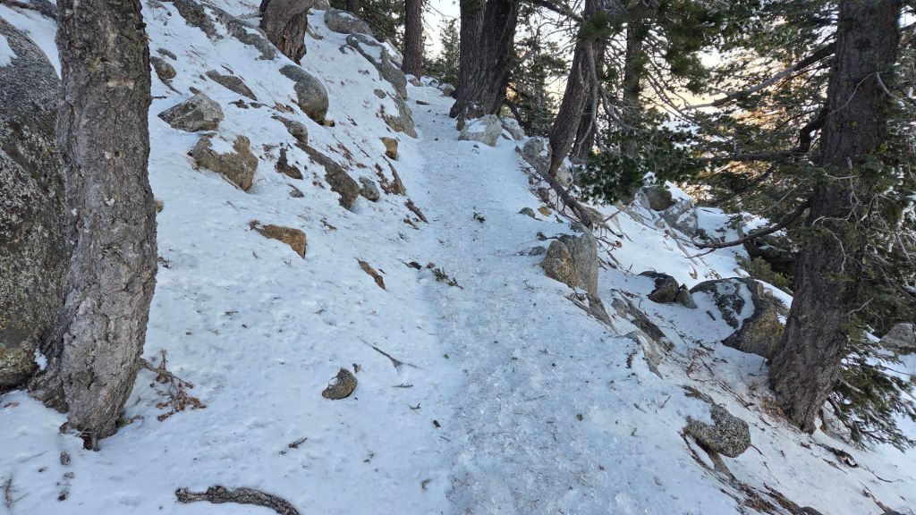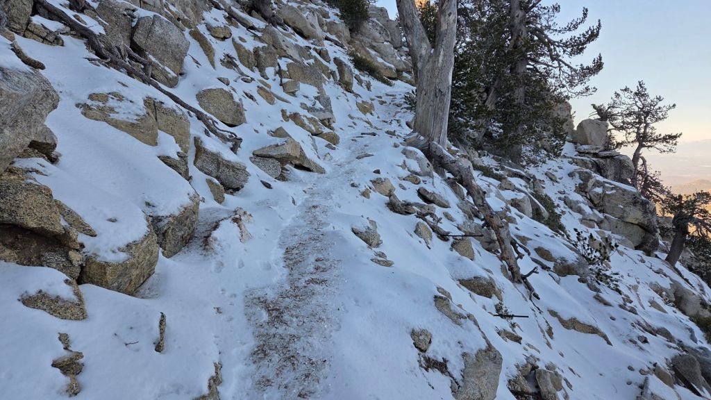 The Peak Trail has an obvious track through very thin continuous snow cover that accurately follows the trail route to the Summit Junction with Deer Springs Trail, and then onward up to San Jacinto Peak. The snow is extremely icy in mornings and in areas that are not sun-exposed. Spikes recommended.