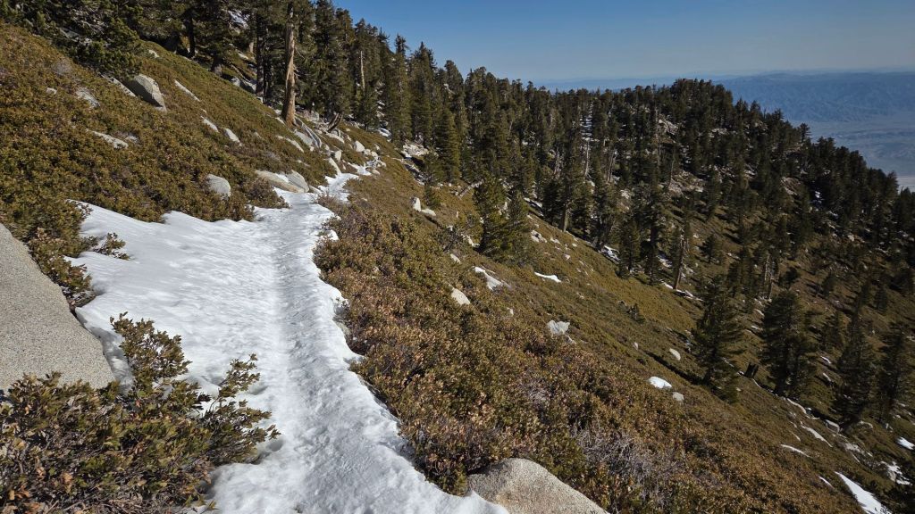 Snow cover remains >60% in trails above about 9700 ft (Deer Springs Trail) and 9900 ft (Peak Trail), and is very icy as it is now compacted from hiker traffic and many freeze/thaw cycles. Melting continues steadily as temperatures remain well above seasonal for the next week.