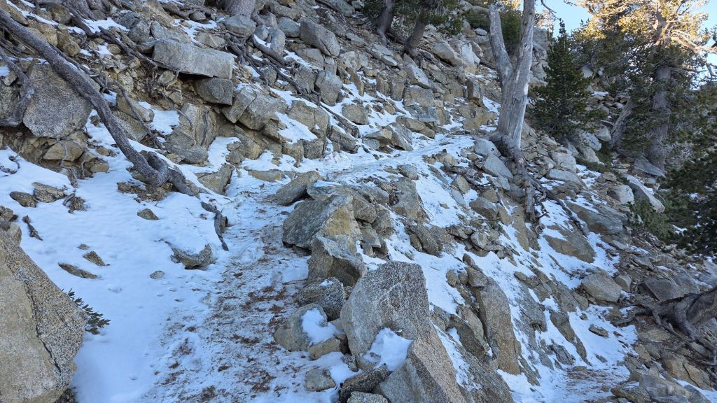 South Ridge Trail [surveyed 10th January] south of Tahquitz Peak is largely clear of snow to 8500 ft (about 5% snow cover above 7800 ft). Icy snow is almost continuous above 8500 ft (switchback 9) but is thin and will melt rapidly next week. Hikers may find spikes useful, especially for descending the uppermost trail (photo below), probably only for the remainder of this week however.